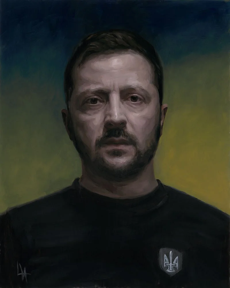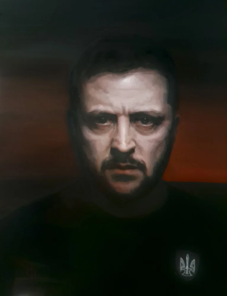 This is an ongoing series of paintings and includes a limited number of portraits of President Zelenskyy. These were inspired by photographs taken by Mads Nissen, who asked the President to focus on the deepest emotions he felt during the darkest hours of the war and what gave him strength.